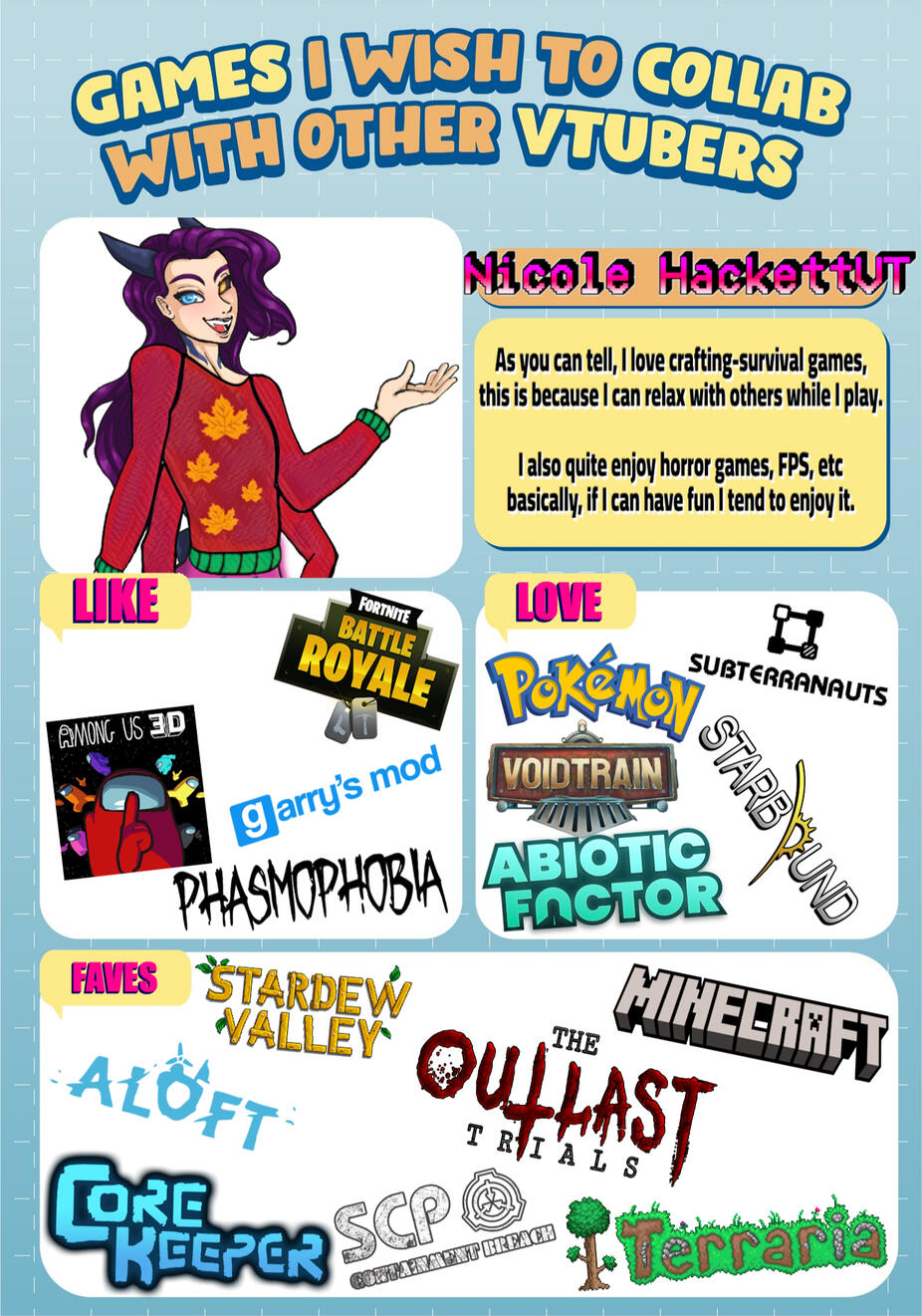 I am a transfem variety streamer on the platforms: Twitch.tv, Youtube & TiktokI always focus my attention on creating a fun and safe environment for my viewers, friends and of course myself.My hobbies are: